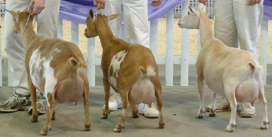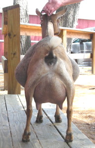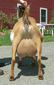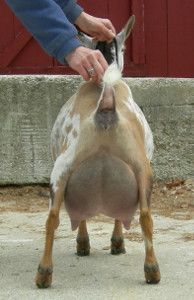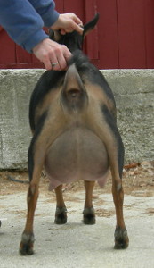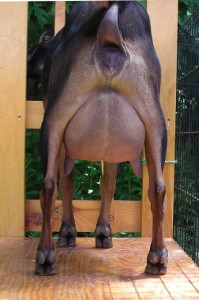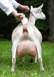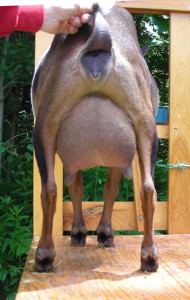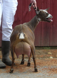 Show wins: I only took her to three shows in 2013, and she won GrCH and BB at all three and finished her CH at only three years old! This included one show with an empty udder; I got confused and milked her out for the Best in Show competition in the first ring of a two-ring show before we had been in the second ring. But she still won in the second ring! | ||
