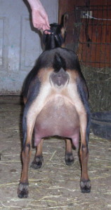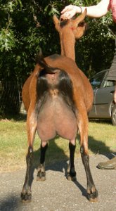 3/16/18. Dark buckskin doe. One of my few does ever to win as a first freshener - she took Reserve Senior Doe at the only show I took her to in 2020. She has a gorgeous body and very nice udder -- moderate size but well-attached with good division and large teats.