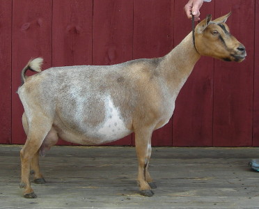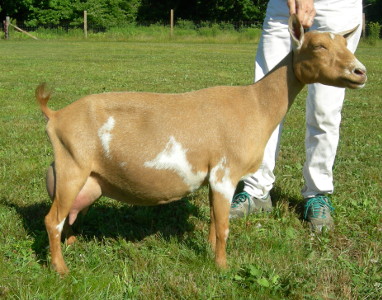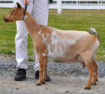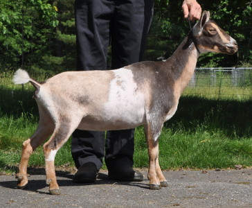 Born 5/14/20, Buckskin/chamoisée with white. Just a really nice, all-around solid doe with a well-attached, productive udder.