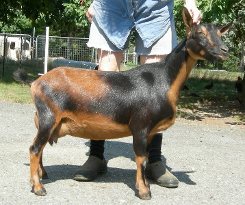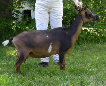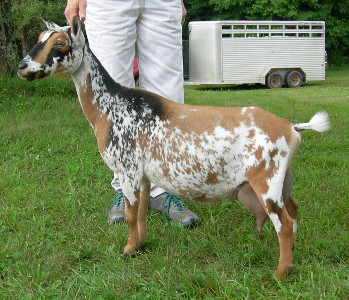 2018: Absolutely gorgeous, can't wait to see her first freshening! 2020: Well, her udder is not very big, but very well attached, and her structure and dairy characteristics are still so beautiful that she earned her two senior championship legs the first two times I showed her as a senior, 2020. The judges both commended her as just what a Nigerian ought to be: long, elegant, upstanding, strong, and looking like a "miniature Alpine." They both said she is the type that all Nigerian breeders should be striving for. 2021: Her udder is much bigger, still very well attached, and developing more medial division, so she is really fulfilling her early promise. Show wins: ADGA: Jr Grand Champion and 1 junior reserve; a senior Reserve and 2 Senior Grand Champions. ADGA Linear Appraisal Results: 2019: VVVV 87 2021: VEVA 85 | ||