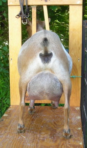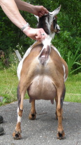 Splashy buckskin-and-white doe with an incredible udder. Born 3/25/14.