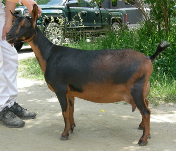Red bay and black. Sadly, I lost my sweet Ailia at only six years old, from pregnancy toxemia. She left behind a lovely half-Nigerian daughter who I hope will carry on her personality, beauty, and tremendous milk production. The pictures are from fall, 2013, during the second year of Ailia's first lactation. I wanted to experience "big goats" and couldn't resist the elegant look of this breed. Thank you, Michael Covey, for this utterly sweet and lovely girl!