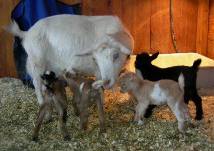 | 2007 with her quads by PromisedLand Incredible Hunk - left to right, Fairlea Jean Valjean, Fairlea Jean-Luc, Fairlea Jean-Jacques, and Fairlea Fleur's Black Falcon. All producing well at various farms around the US (except Jean Valjean, who died suddenly, but left behind several promising doelings.) |