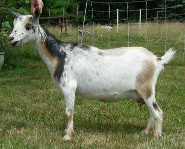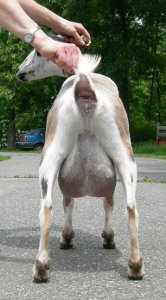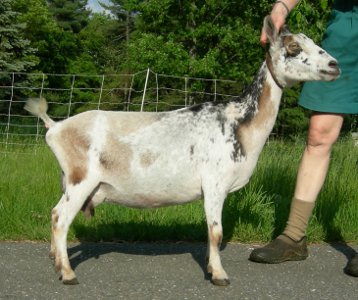 | May, 2010, her first freshening. The side picture has no milk in her udder - just took her from her kids for a quick picture to update her page until I can get better pictures. |