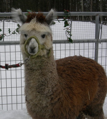 Little Chewpaca is having his first Christmas here. He was too skittish to get near any major Christmas items, so I twisted a strand of imitation holly on the fence behind him. Unfortunately the snow was so bright and the sky so dark that all the colors are washed out, almost like a plain black-and-white picture.