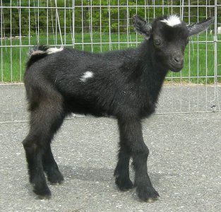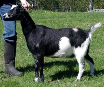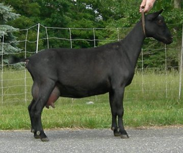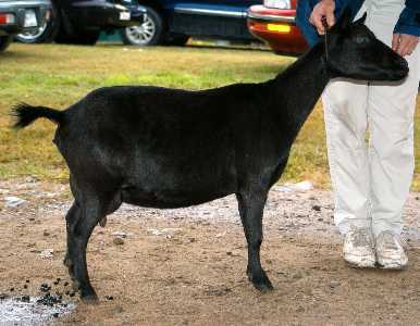 (MCH OTR Magic's M Heracles X Stonewall's Ame Ebi*D) Solid black, born 1999. Li Hing is an excellent show, breeding, and milking animal with beautiful conformation, lovely manners, and a nice udder. She is a very refined doe, an outcross between Goodwood and OTR lines. Her one fault is a somewhat poorly attached foreudder. She produced triplets both the years I bred her (2003 and 2004) and fed them all easily, producing a LOT of milk. She won a Grand Champion leg and two Reserves, all three as a Junior. She arrived here originally as a visitor in 2002 and I sold her in July, 2004. She is now living with Valerie Silverthorne Longears Farm in West Newbury, MA. |