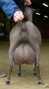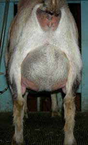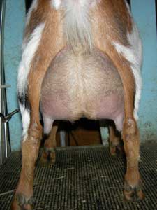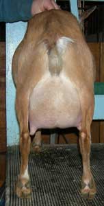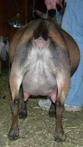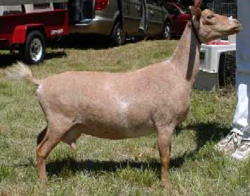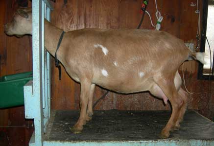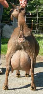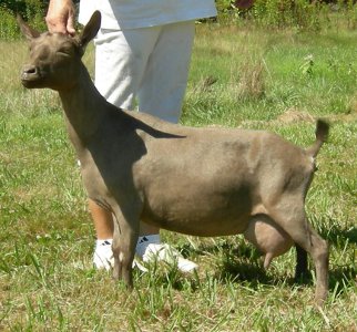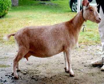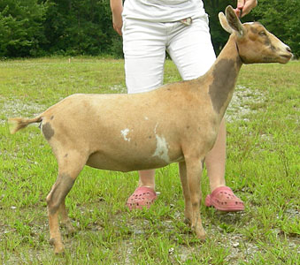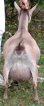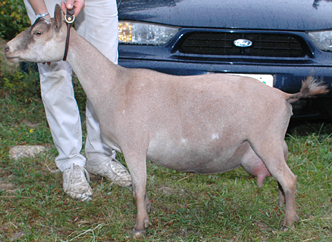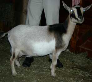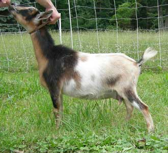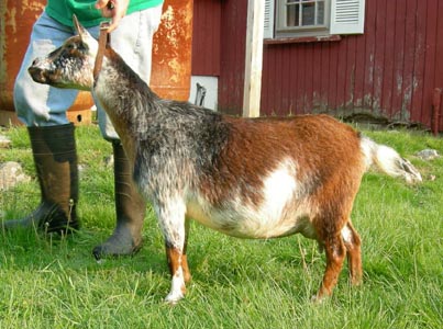 | Polled repartita buckskin with white. Here's a preliminary picture of her in milk - unclipped, hairy goat, but at least the udder is clipped. Mimi is now living with Valerie Gillispie in Virginia. | ||