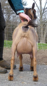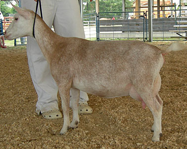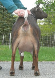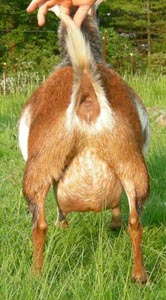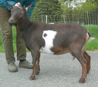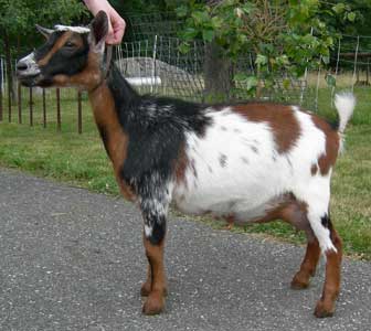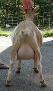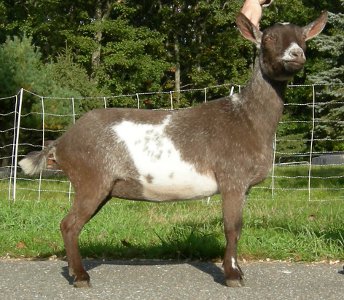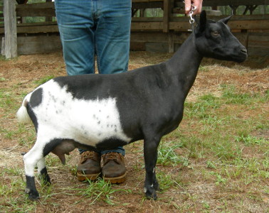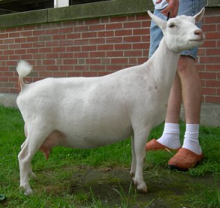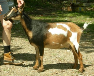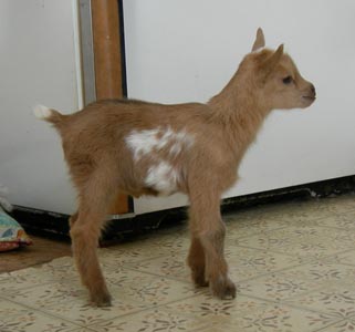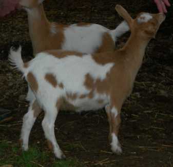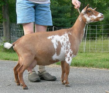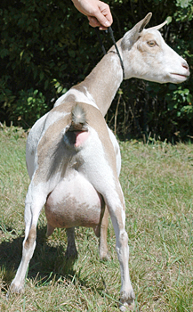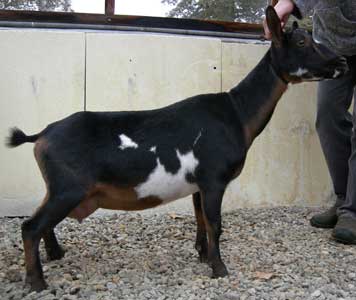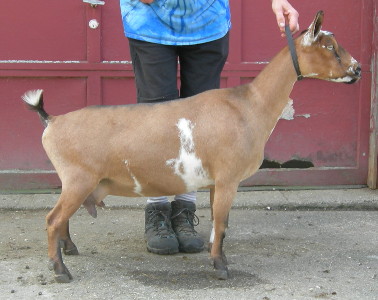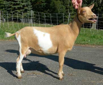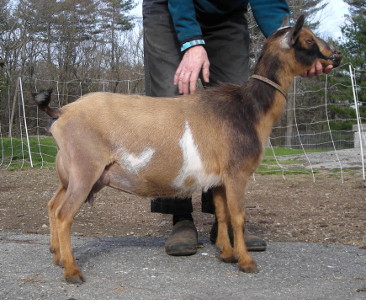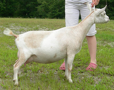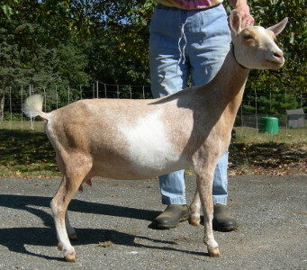 | Pale gold and white, born 2/15/08, a twin. As a yearling first freshener, she has a very capacious udder and should make an excellent milker. She now lives in PA with Austin Armor Frey. | ||