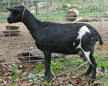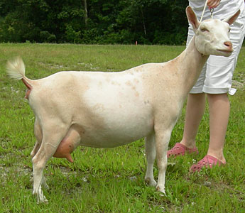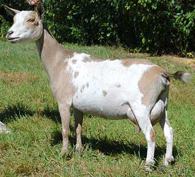 | Mostly white with gold spots on rump and hind legs, born 4/9/06, one of triplets. Photo taken August, 2008, during her first freshening. She is now living with Fonnie Thoman at Riverview Farm in Crown City, Ohio. | ||