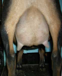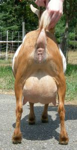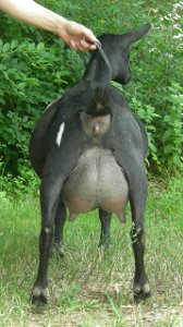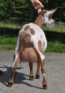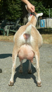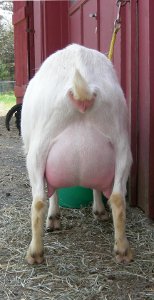 White doe, born 3/10/15. Photos are this summer, her first freshening. She is way too fat, of course, but she is on a diet now.