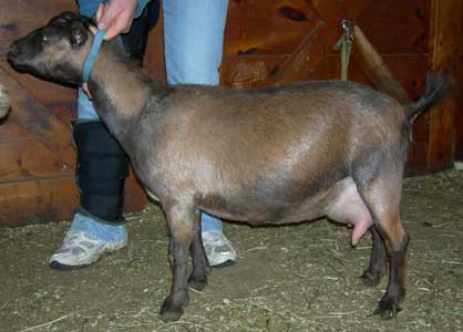 | Polled, dark chocolate chamoisee, born 3/4/07, a triplet. Photos August, 2009, first freshening. Also now with Joshua Bentley. | ||