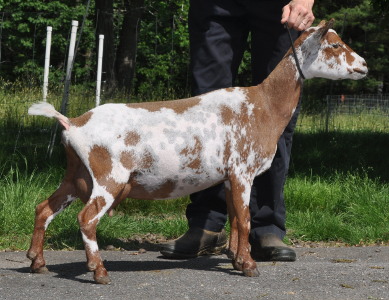 Beautiful general appearance, but unfortunately she injured her shoulder as a yearling and although she doesn't limp, she often stands a bit oddly. She is now living with the Botellas in Smithfield, RI.   ADGA Linear Appraisal Results: 2019: +++V 82 - Bob Bartholomew | ||