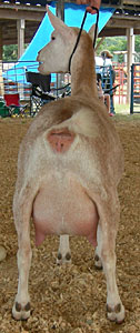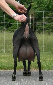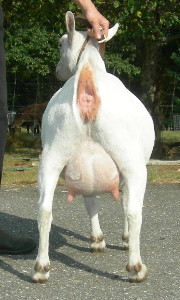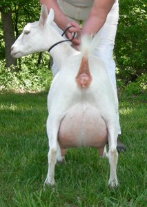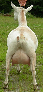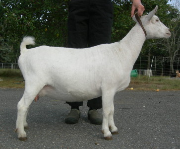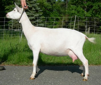 White, born 4/21/08, a twin. Photos from summer, 2010, her second freshening. Although she is a rather heavy-set goat (a legacy from her grand-sire Flatrocks Diamond Rio), her udder looks remarkably like Fleur's - which isn't surprising, really, considering that her breeding is almost exactly the same. Snowy is now living with Kenneth LaRoche in Cobalt, CT.