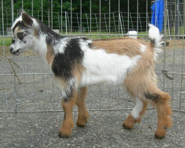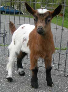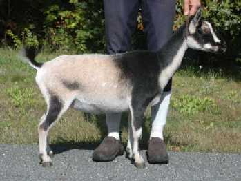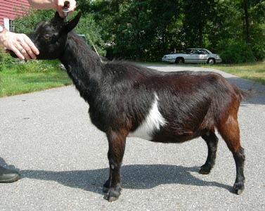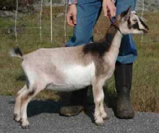 | Grey and red buckskin with white markings, born 3/31/01. Daisy is the exact same breeding as Fairlea Troy. She was sold as a kid but never bred and later returned to me and produced triplets as a six-year-old first freshener. She is now at the Essex County Agricultural High School in Hawthorne, MA, as part of the school's new Nigerian goat project. | ||
