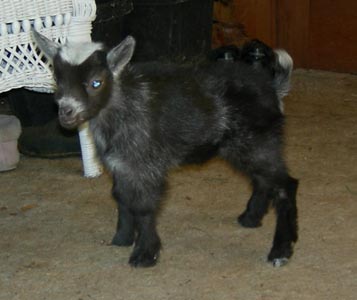 | Frosty dark chocolate and white, born 4/16/10, a triplet. (She doesn't have a crooked mouth - she's just chewing her cud, but I admit that after seeing these pictures, I went back out to the barn and checked!) Lizzy is now living with Vanya, Christine, and Matthew Voors. | ||