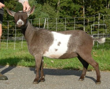 | Polled, chocolate repartita buckskin with a little frosting on the ear bases, born 4/6/07, a triplet. Beautiful and elegant body; large and almost too-productive udder. Pictures are from 2010. Niambh is now living with Jennifer Farrington in Maine. | ||