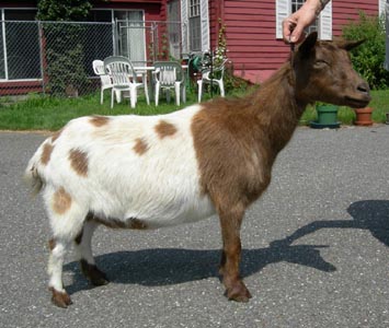 | Frosty buckskin and white, born May, 2004. Tulip was sold as a kid and later returned. She is now at the Essex Agricultural High School in Hawthorne, MA, as part of their Nigerian goat project. She was nearly dry when I took this picture, so it is not a good representation of her udder. | ||
