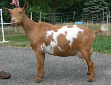| Polled, gold and white, born 4/6/07, a triplet. We were thrilled that Niambh's beautiful sister recently returned to us along with her young quadruplets. She has a junior leg, won from the 2-4-month-old kid class. She freshened this spring with a very productive udder, although not quite as nice as her sister's, and she should make a capacious milker. She now lives in Pennsylvania with Austin Armor Frey. | ||