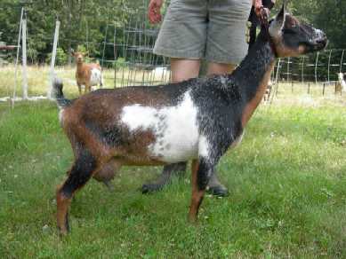 Dark buckskin with white spots, born 8/10/08, a singleton. Very sweet personality, very dairy, and lovely general appearance. She is very tiny - I keep expecting her to grow more, but it looks like she will stay very small. Pictures are from summer, 2010, her first freshening. She and her daughter Juliette are now living with the Blenkhorns in Foxboro, MA. | ||