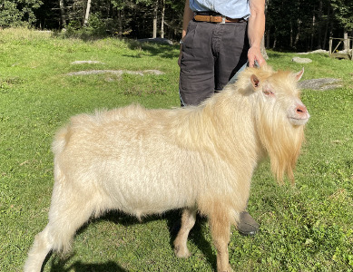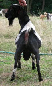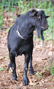 5/10/09 - 11/11/17   ON LEASE   Caesar's Villa BB Rebel Yell *S X ARMCH Flat Rocks Here for the Party *D E   Plain Black. Sadly, we lost Apache on 11/11/17. He got the worst in a fight in the buckpen and slowly lost his ability to move, so we laid him to rest before the approaching winter could make his life even more difficult. Thank you, Joanne Karohl, for loaning us this elegant and very sweet boy. He has been siring beautiful bodies and legs and has at least two Junior Best in Show daughters. His beautiful first-freshener daughter Minerva is very promising. Further information and pictures at Dragonfly Farm's website. |