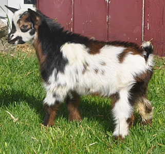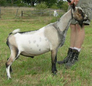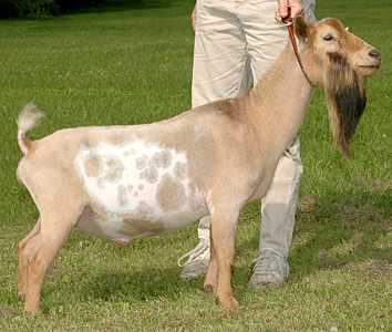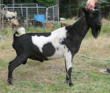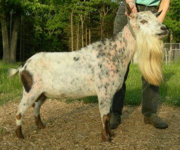 4/9/12 - 11/10/21   Flat Rocks Night Raven X GCH Fairlea Marguerite 4*D E, 4*M   Frederic's page   Born 4/9/12. Polled dark buckskin but mostly white. I sold him to Anita Beck as a kid, but later he came back here and produced beautiful, elegant, dairy kids. |