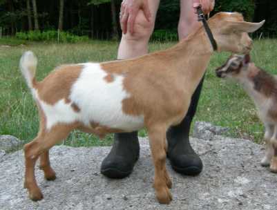 4/18/10 - 1/6/21   MCH/CH Dawnland Tabby's Halifax E X Fairlea Marguerite 4*D E, 4*M   Edmond's page Pedigree   Gold and white (carrying buckskin), a triplet. The picture is fall, 2011, as a yearling. A very sweet boy who did an excellent job of improving all the does he was bred to, especially including nice, well-attached udders and large, soft teats. |